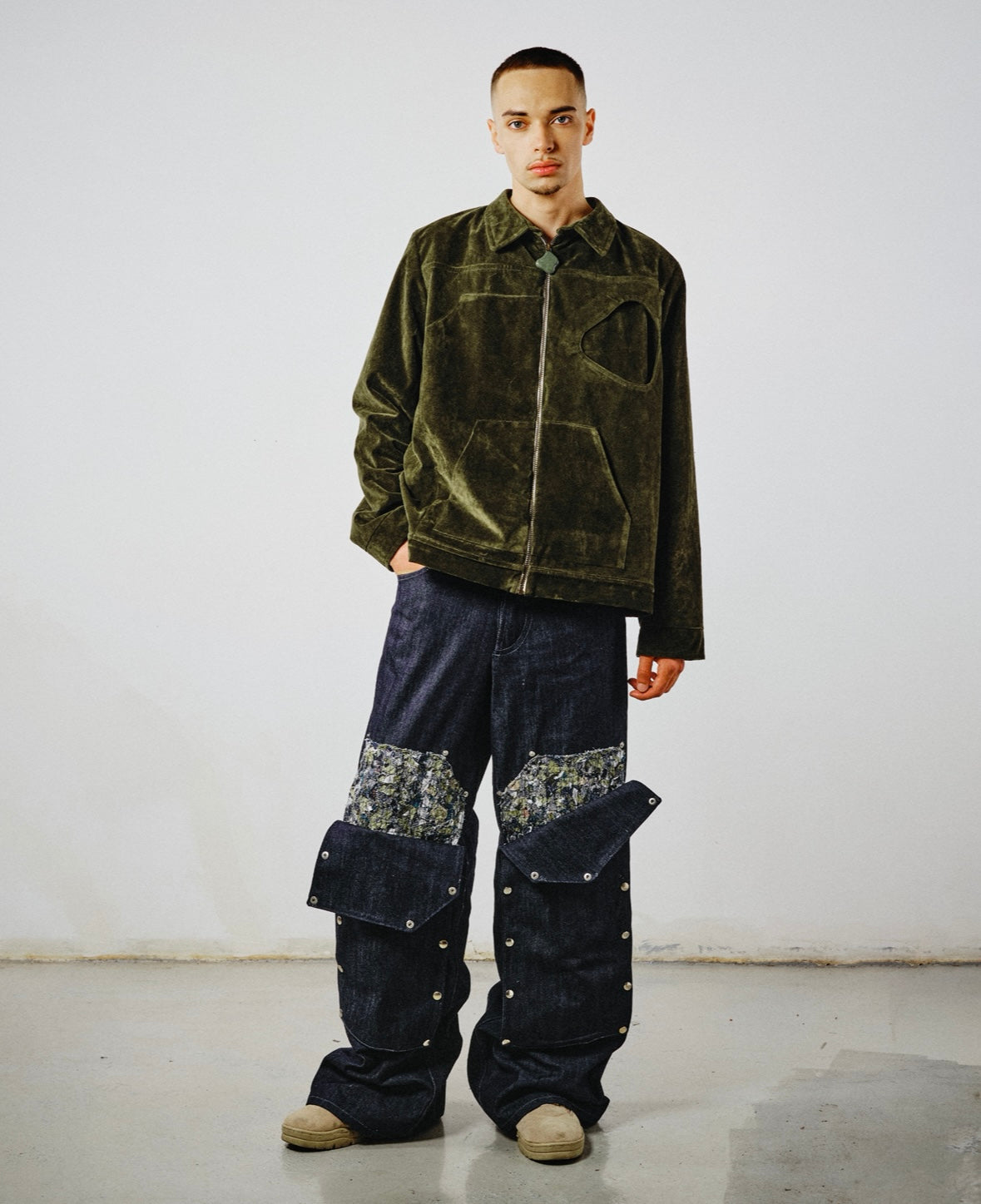 Suédine kaki, empiècement carpenter, poche poitrine signature , poches plaquées, citation assemblée à la main dans le dos, ouverture zippée, doublure mélange laine/synthétique camouflage.