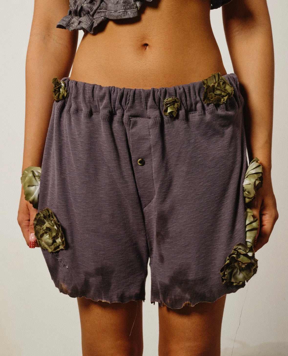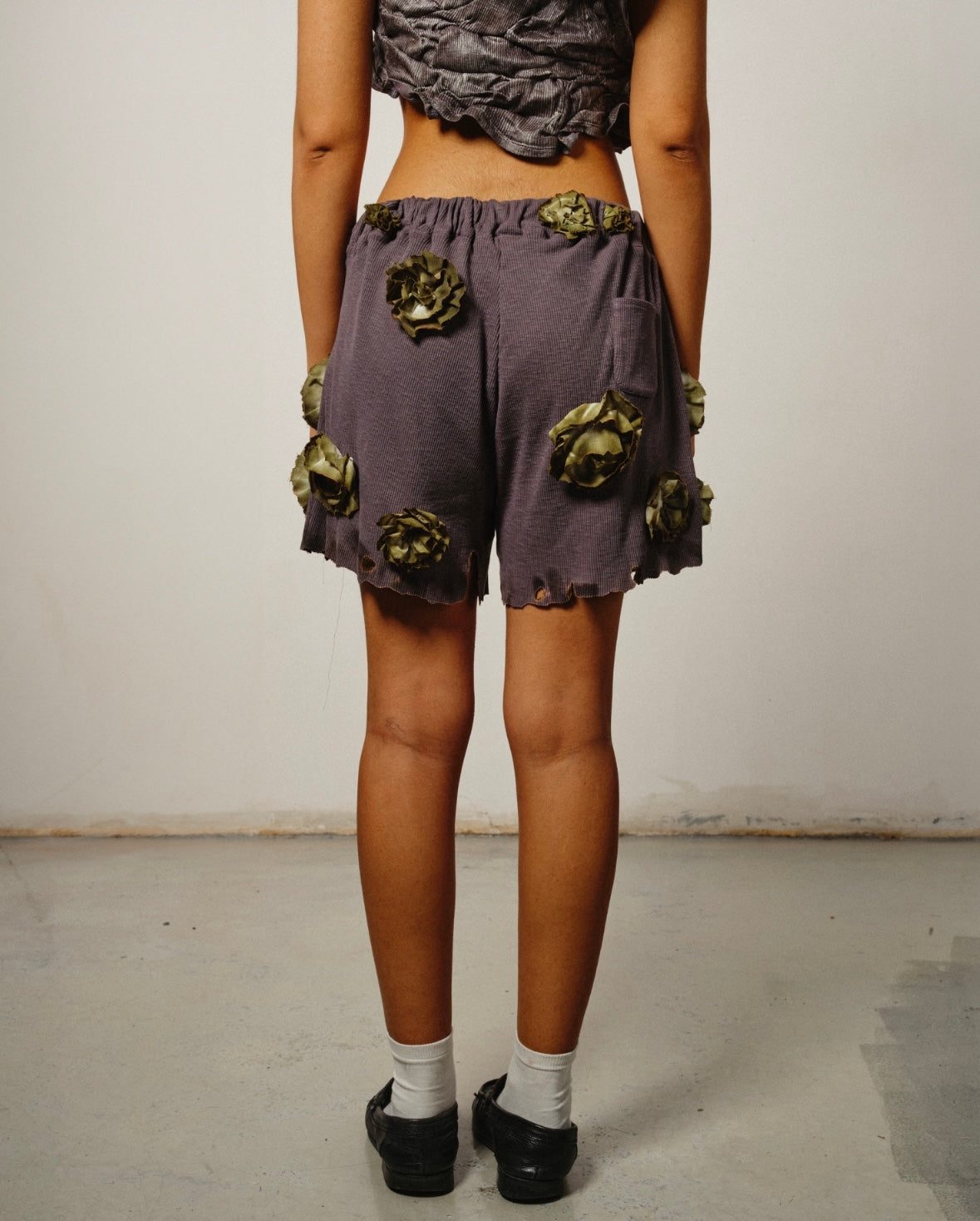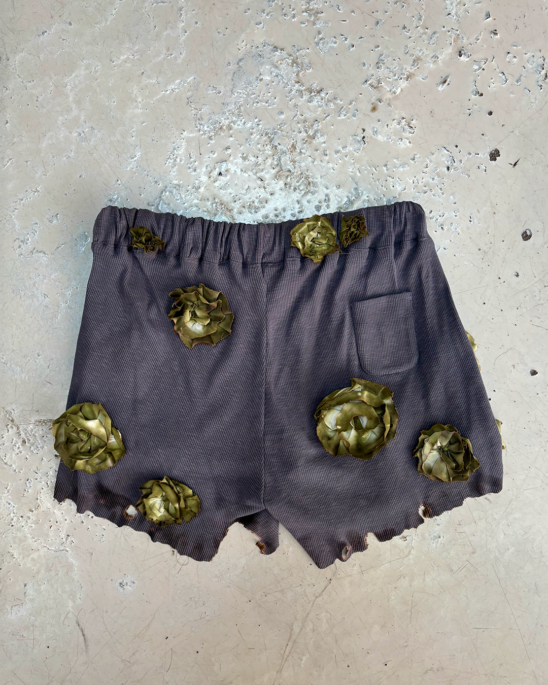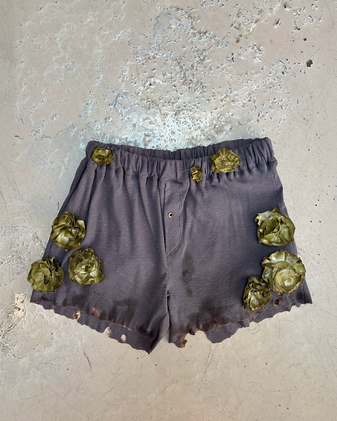 Jersey de coton côtelé charcoal, fleurs en coton teintes, assemblées et brûlées à la main, brûlures en bas de produit.