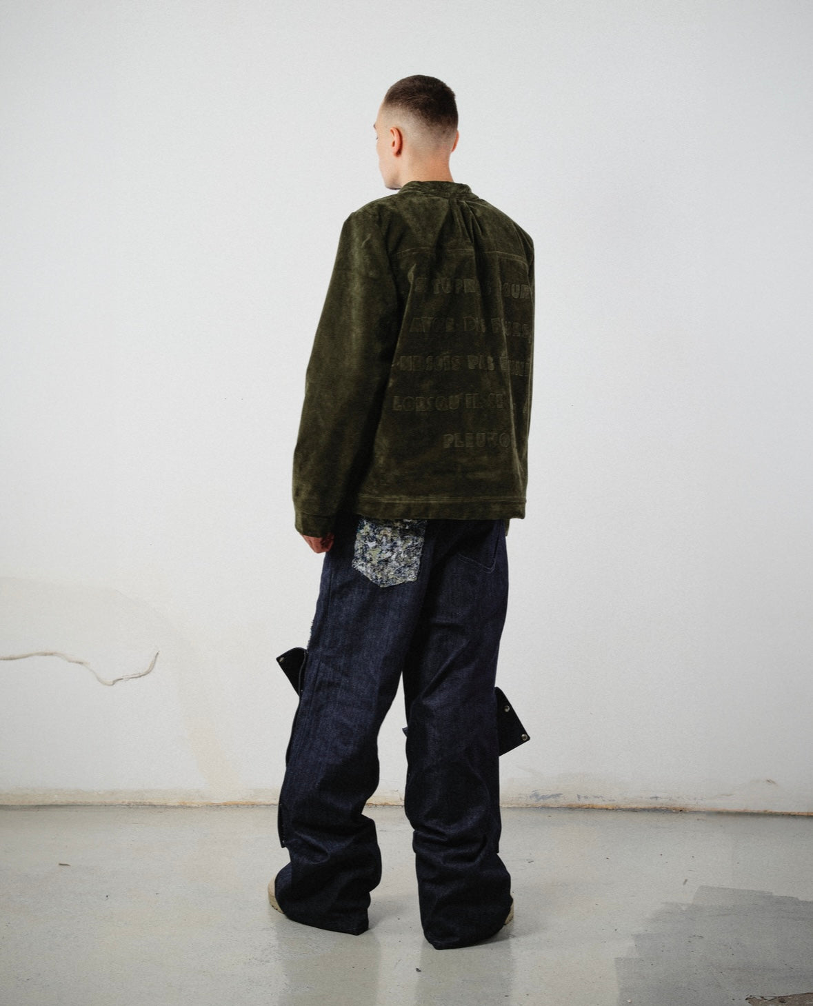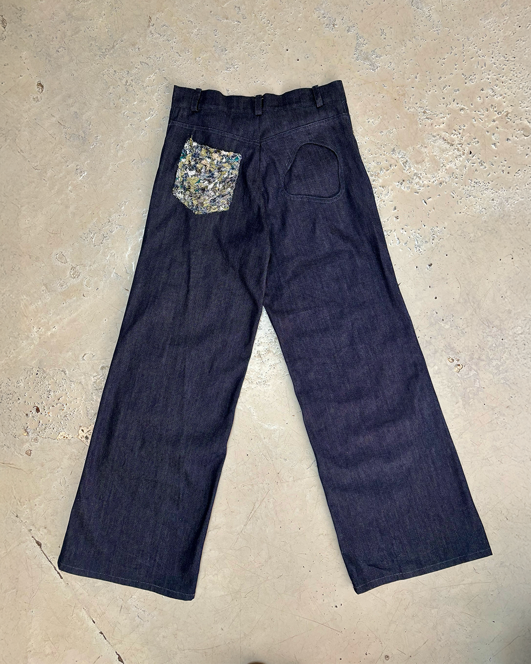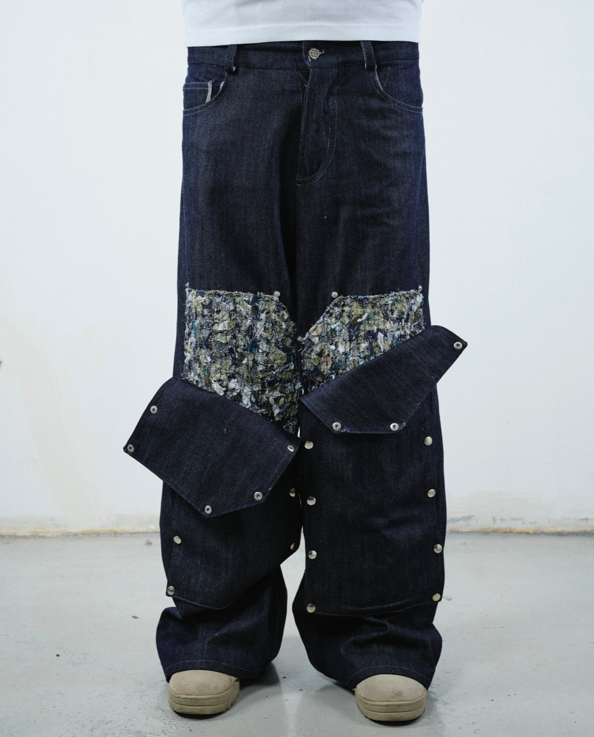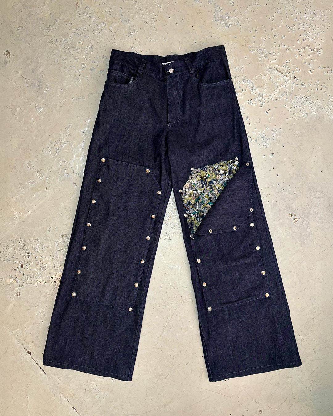 Denim brut coton, coupe baggy, empiècements carpenter amovibles par pressions, empiècements carpenter en chutes de tissus naturels et synthétiques plaqués, poche dos signature, poche dos plaquée en chute de tissus.
