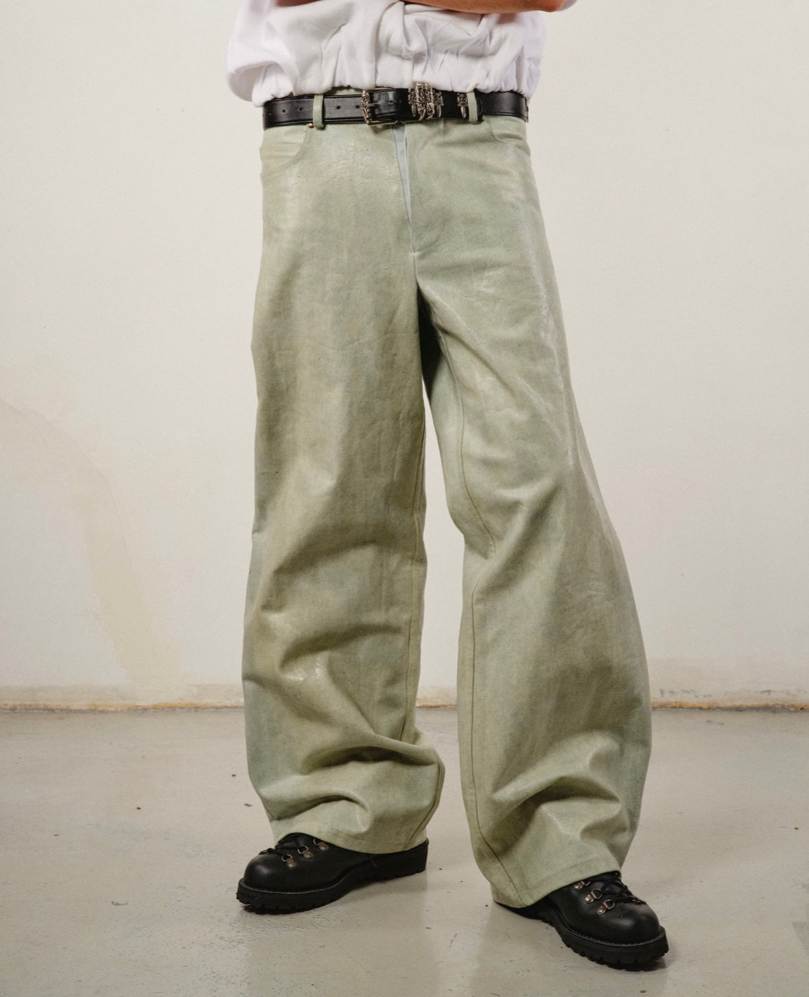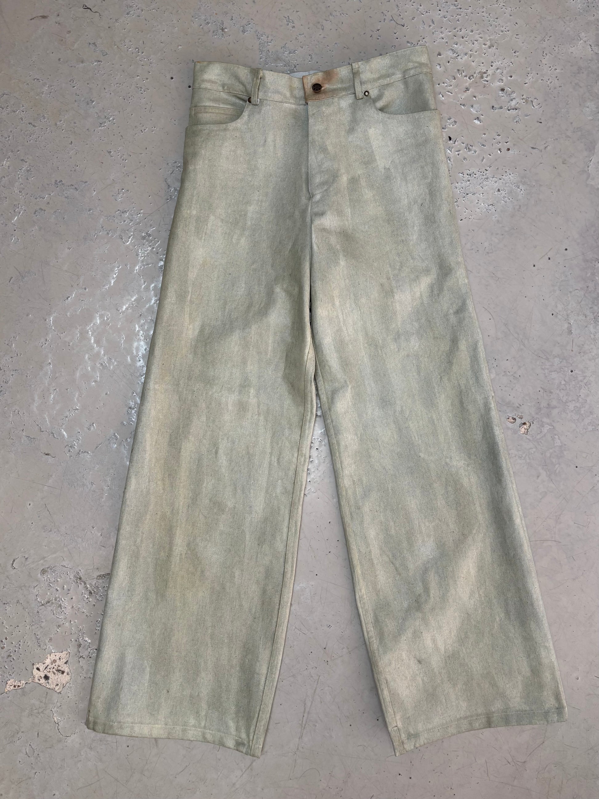 Denim coton menthe claire enduit de silicone à la main, poches dos signature.